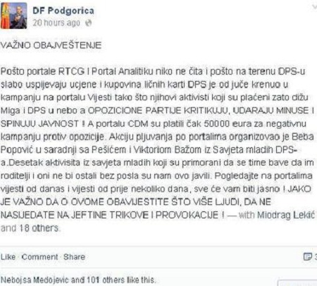 - Pošto portale RTCG i Portal Analitiku niko ne čita i pošto na terenu DPS-u slabo uspijevaju ucjene i kupovina ličnih karti DPS je od juče krenuo u kampanju na portalu Vijesti tako što njihovi aktivisti koji su plaćeni zato dižu Miga i DPS u nebo a opozicione partije kritikuju, udaraju minuse i spinuju. A portalu CDM su platili čak 50.000 eura za negativnu kampanju protiv opozicije. Akciju pljuvanja po portalima organizovao je Beba Popović u saradnji sa Pešićem i Viktoriom Bažom iz Savjeta mladih DPS-a. Desetak aktivisita iz Savjeta mladih koji su primorani da se time bave da im roditelji i oni ne bi ostali bez posla su nam ovo javili. Pogledajte na portalima Vijesti od danas i Vijesti od prije nekoliko dana, sve će vam biti jasno ! Jako je važno da o ovome obavijestite što više ljudi , da ne nasijedate na jeftine trikove i provokacije, napisano je u poruci na Fejsbuk profilu ''DF Podgorica''.