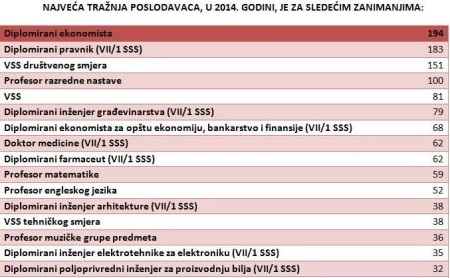 Kada je u pitanju visoko obrazovanje, mnogobrojne analize su, kako kaže naša sagovornica, pokazale da su najtraženija zanimanja iz oblasti ekonomije, prava, elektronike, telekomunikacije i računara, građevine, turizma, mašinstva, računovodstva i finansija.