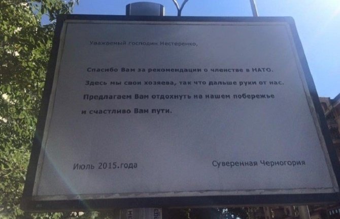 Naime, na bijeloj pozadini bilborda stoji uočljiv tekst na ruskom jeziku, gdje se naručilac zahvaljuje Nesterenku na preporukama za članstvo u NATO-u.
